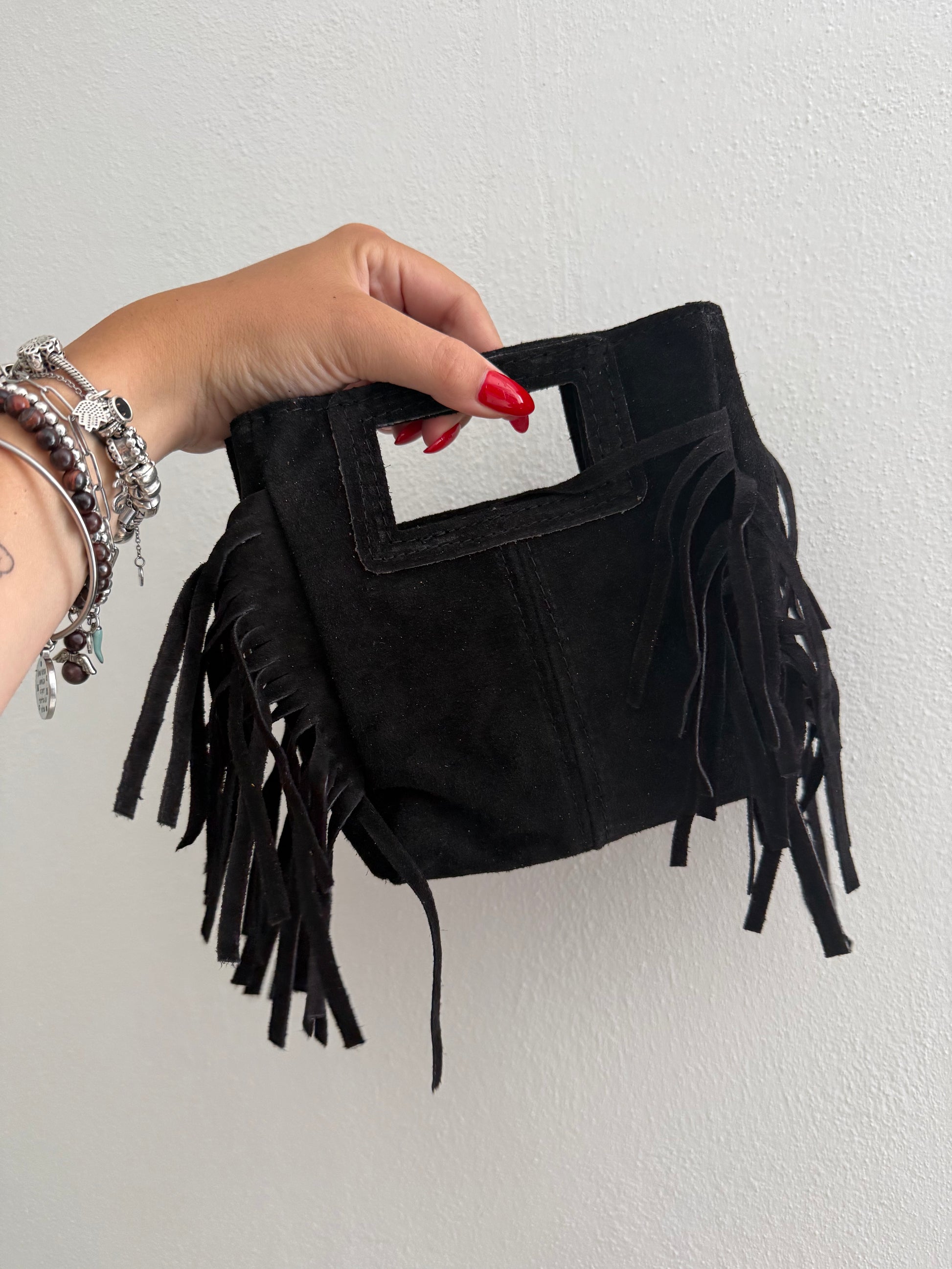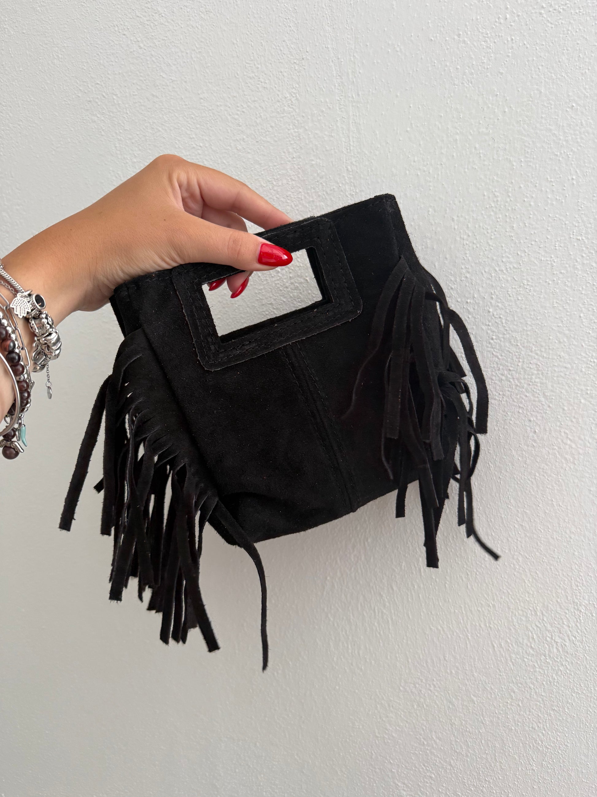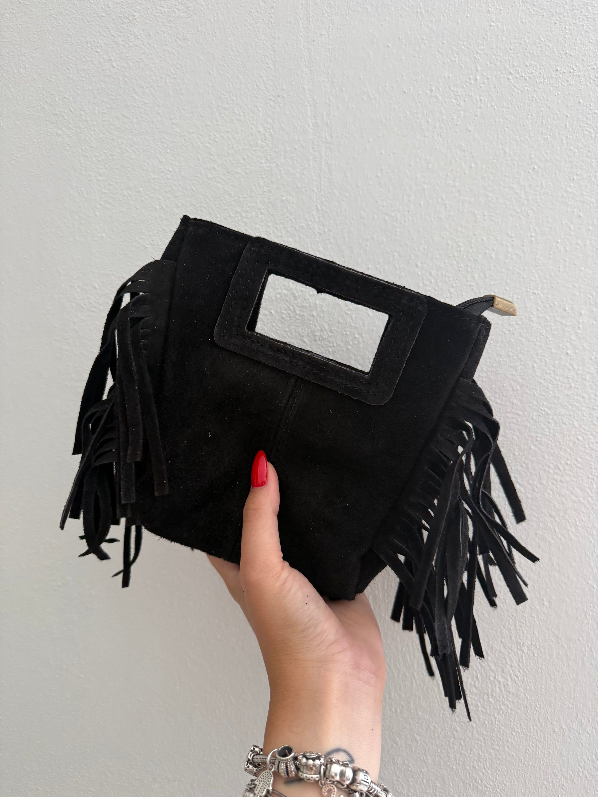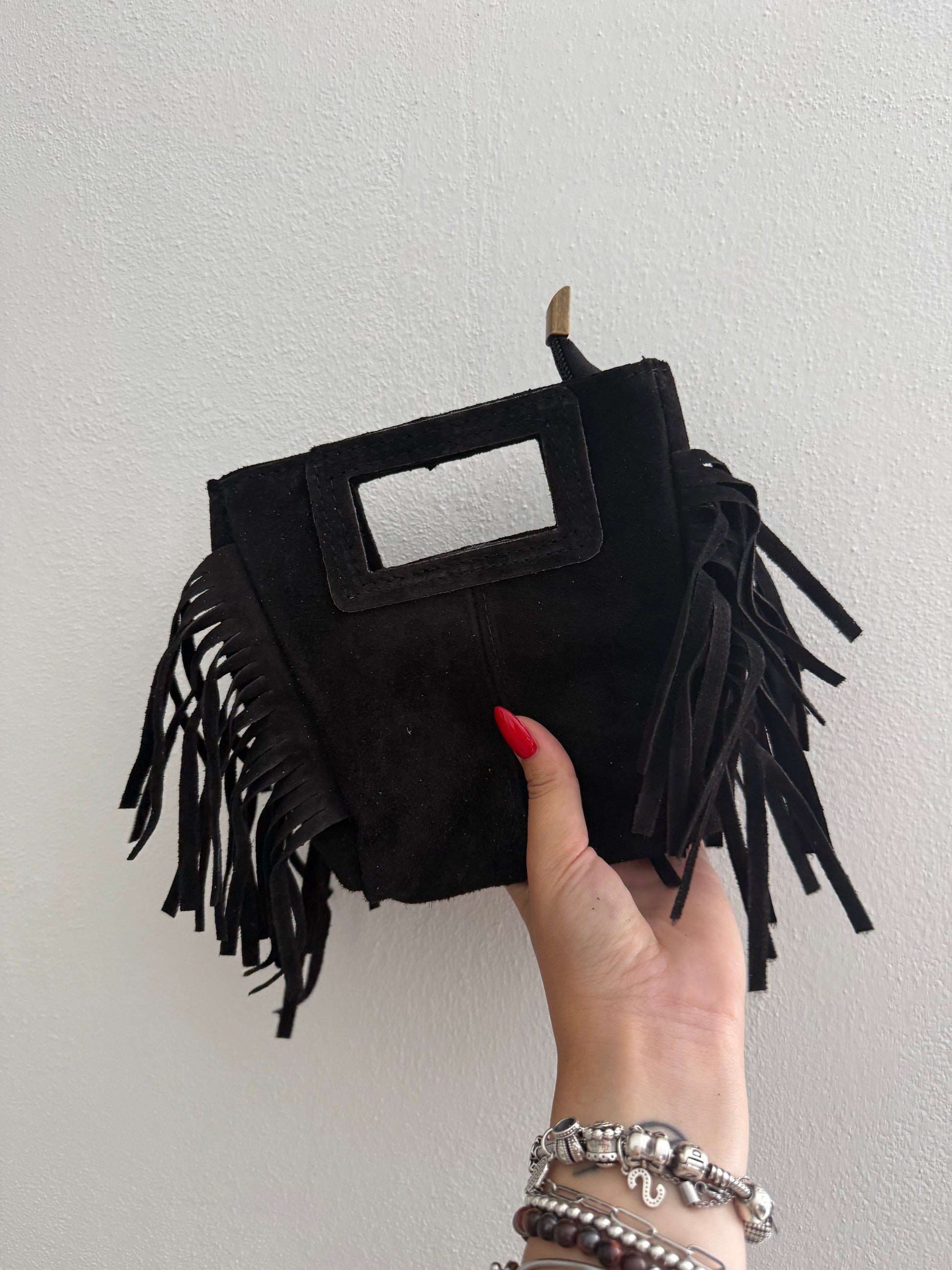 Elyse bag 100% camoscio. Borsa con frange. Chiusura zip. Con tracolla regolabile annessa. Dimensioni 18 x 18 cm