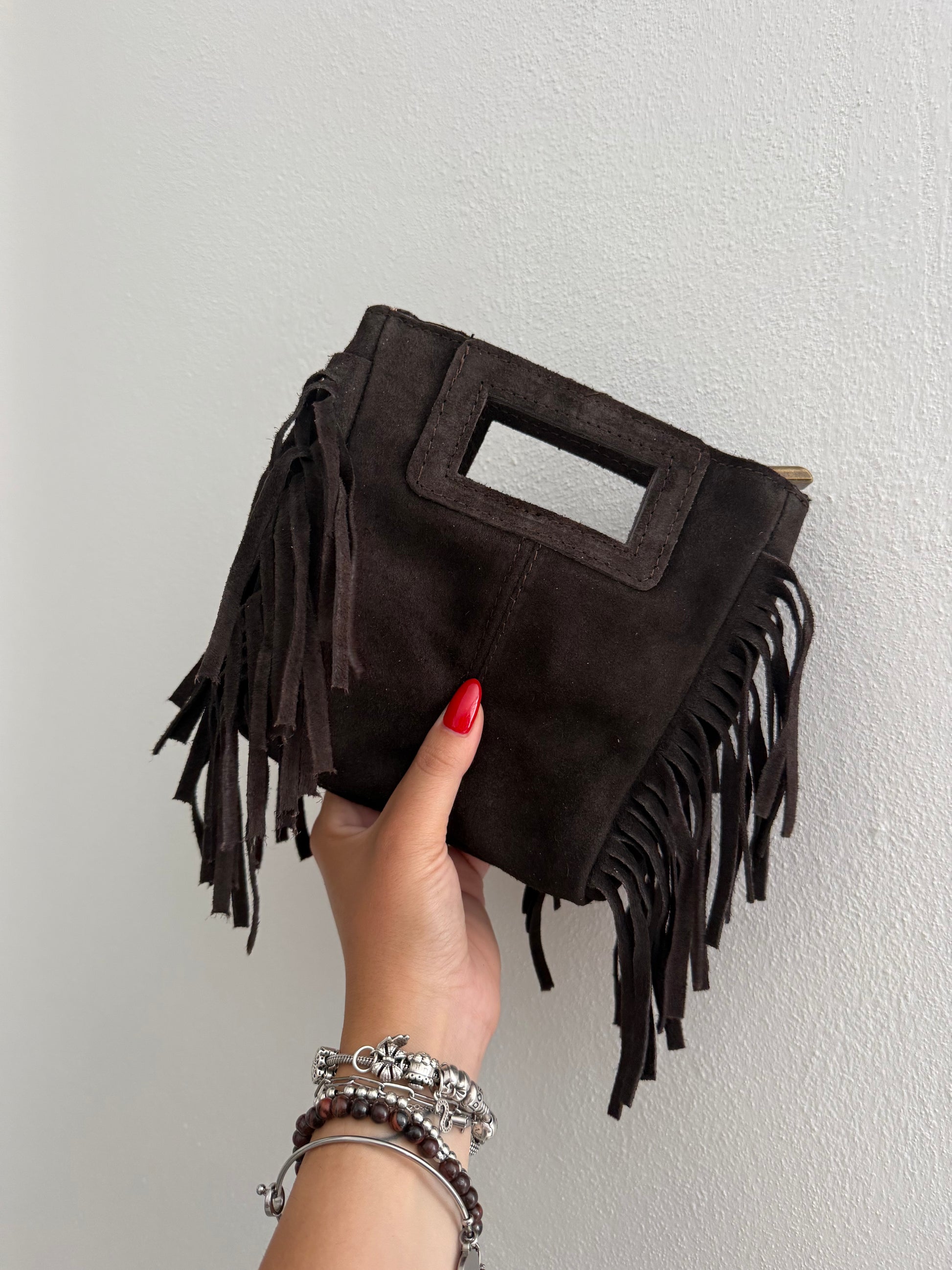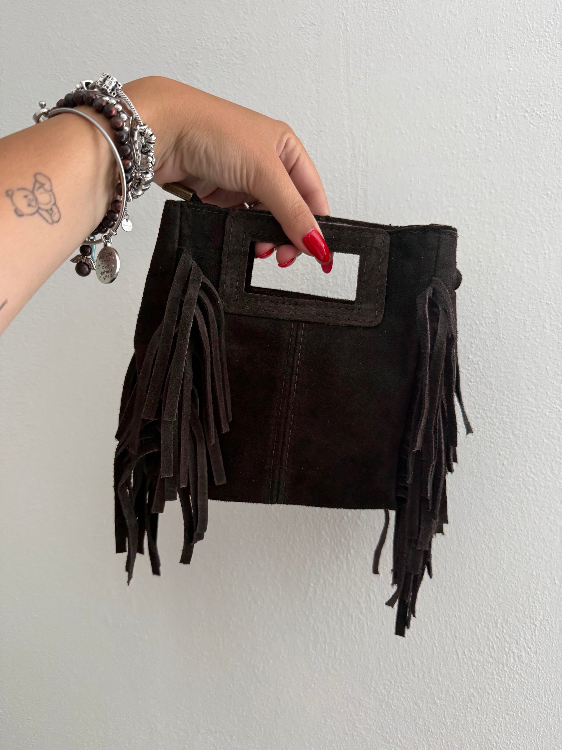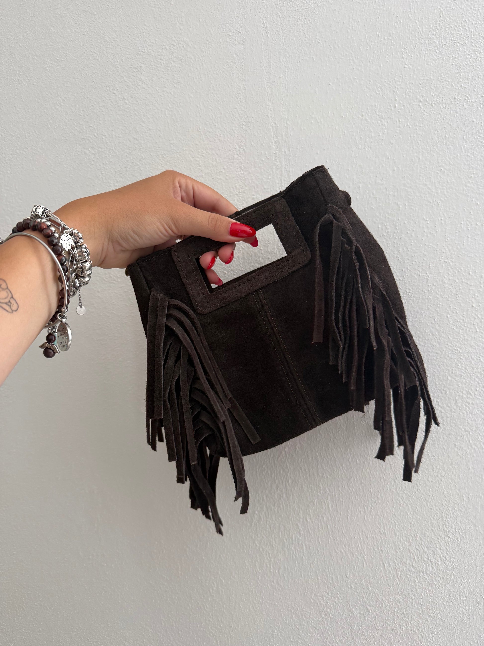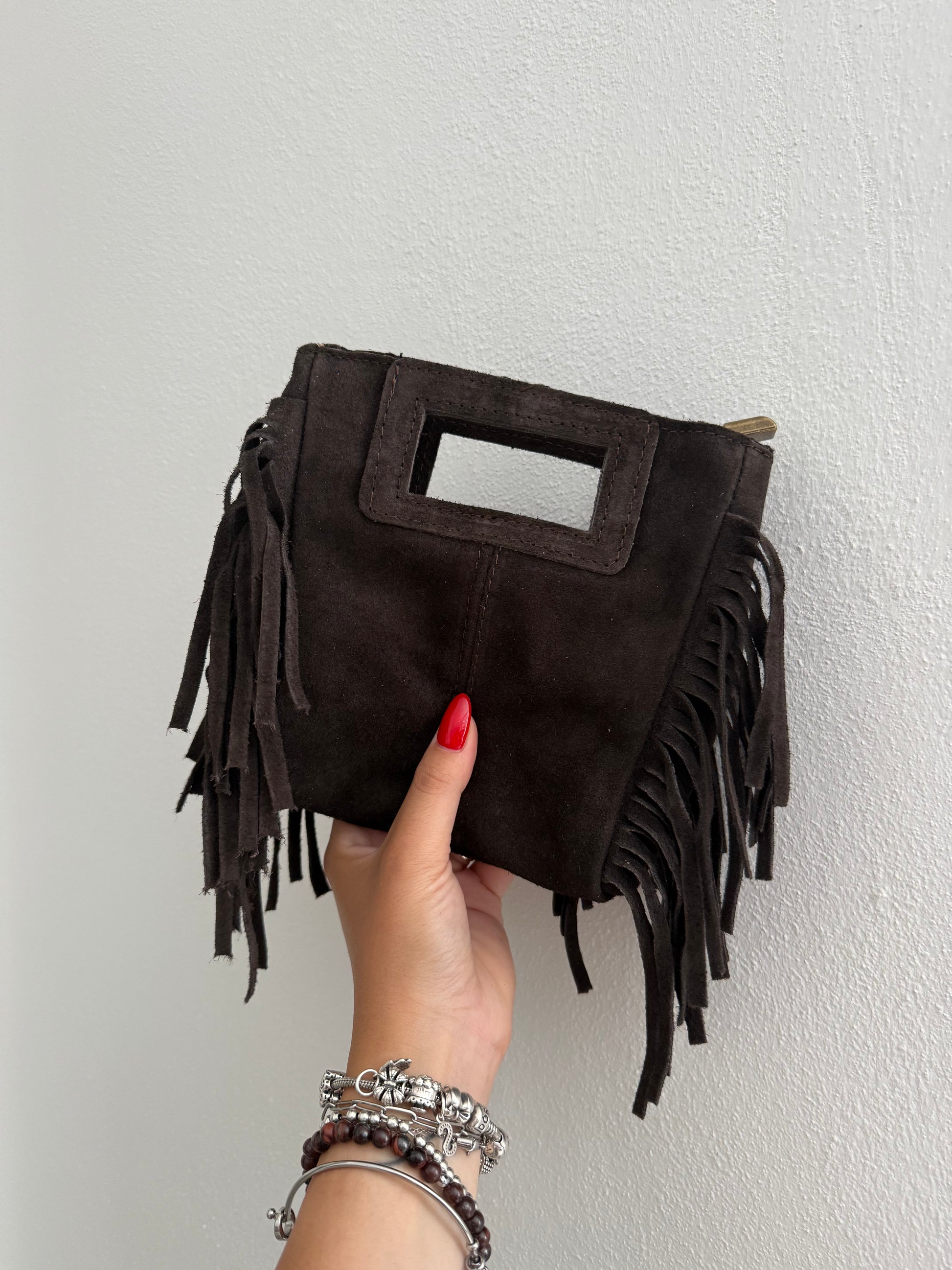 Elyse bag 100% camoscio. Borsa con frange. Chiusura zip. Con tracolla regolabile annessa. Dimensioni 18 x 18 cm